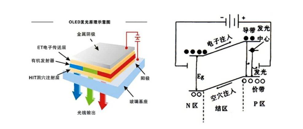 LED主要由帶PN結(jié)構(gòu)的固體半導(dǎo)體(芯片)、電極和光學(xué)系統(tǒng)組成。外部電源給P/N結(jié)兩端加以正向電壓,使電流從P區(qū)流入N區(qū),N區(qū)不斷注入電子,P區(qū)則不斷注入正電荷,當(dāng)電子和電荷的能量達(dá)到一定值時,P/N結(jié)處的電子與電荷便產(chǎn)生跨越,此時,電子與空穴相結(jié)合,在結(jié)合的過程中產(chǎn)生大量的能量,而這些能量以光的形式釋放出來,即為LED發(fā)光原理。