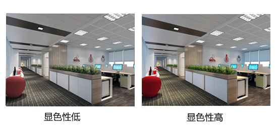顯色性是燈具的基本參數(shù),反映的是照明光源(燈具)對(duì)物體(辦公環(huán)境)色彩還原程度,而顯色指數(shù)就是評(píng)價(jià)光源顯色性的重要方法,通常以百分比的形式表示,顯色指數(shù)越高,色彩還原度越高,顯色指數(shù)越低,色彩還原度越低。