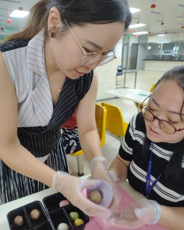 活動(dòng)中,烘焙老師手把手教學(xué),和面、包餡、搓圓、放入模具按壓成型。大家根據(jù)自己的審美進(jìn)行配色、造型,雖然都是第一次動(dòng)手做月餅,但大伙兒都做得有模有樣。在一片歡聲笑語中,一個(gè)個(gè)精致的冰皮月餅在大家的手中誕生。