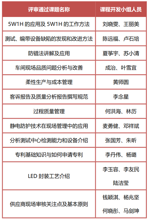 為表彰國(guó)星光電第一批通過評(píng)審認(rèn)證的課程及內(nèi)訓(xùn)師,公司于11月28日召開內(nèi)訓(xùn)師培養(yǎng)項(xiàng)目結(jié)班暨表彰儀式,公司黨委委員、副總裁 李蒲林,公司董事、副總裁 胥小平出席會(huì)議。會(huì)上表彰通過評(píng)審驗(yàn)收課程12個(gè),通過內(nèi)訓(xùn)師資格認(rèn)證內(nèi)訓(xùn)師24名。其中組件事業(yè)部《靜電防護(hù)技術(shù)在現(xiàn)場(chǎng)管理中的應(yīng)用》獲得最佳課題獎(jiǎng);組件事業(yè)部麥勇健、RGB器件事業(yè)部劉曉雯、光電子器件事業(yè)部馬劍坤獲得最佳演繹獎(jiǎng)。