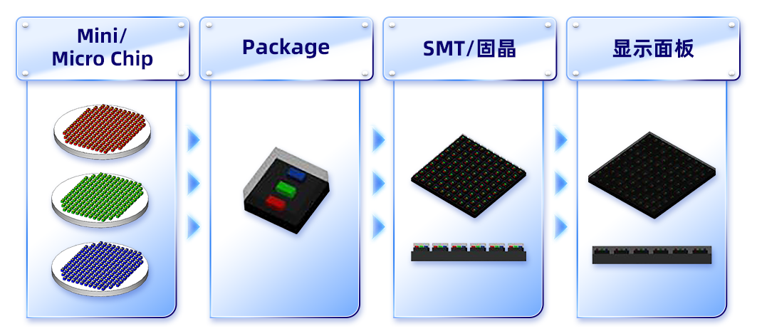 MIP(Mini/Micro LED in Package)封裝技術(shù)是將Mini/Micro LED芯片進(jìn)行芯片級(jí)封裝,切割成單顆器件,再進(jìn)行分光混光,最后進(jìn)行貼片工藝或屏體表面覆膜,完成顯示屏的制作。MIP作為一種新的獨(dú)立器件封裝結(jié)構(gòu),可完美繼承“表貼”工藝,并隨著Mini/Micro LED芯片價(jià)格的不斷降低,有力推動(dòng)微間距市場(chǎng)向低成本的技術(shù)迭代。