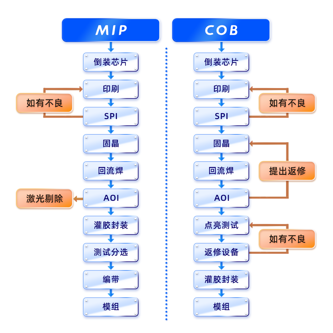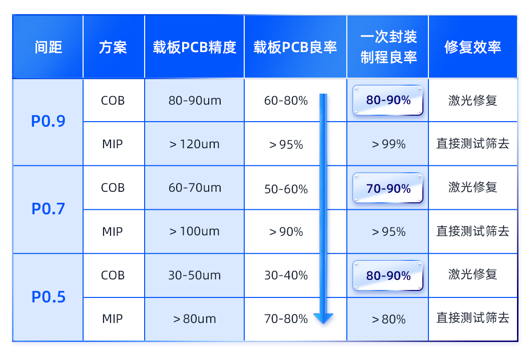 3.MIP和SMD一脈相承,能夠沿用SMD生產(chǎn)設(shè)備,工藝穩(wěn)定,設(shè)備變量小,無(wú)須重資產(chǎn)投入;COB則需單獨(dú)投資生產(chǎn)線,要求較大的資本投資,且工藝變化大,容易造成設(shè)備投資浪費(fèi)。
